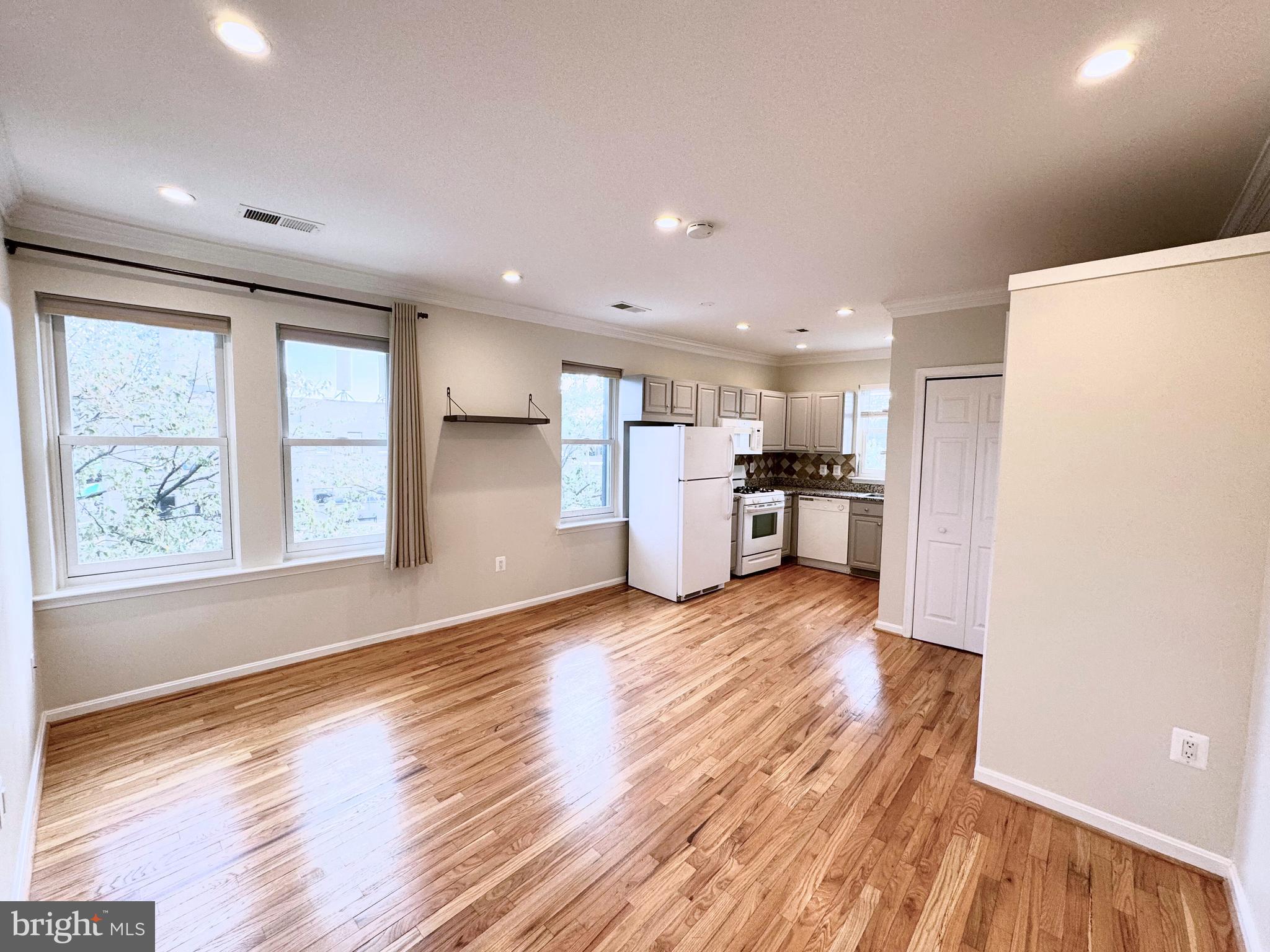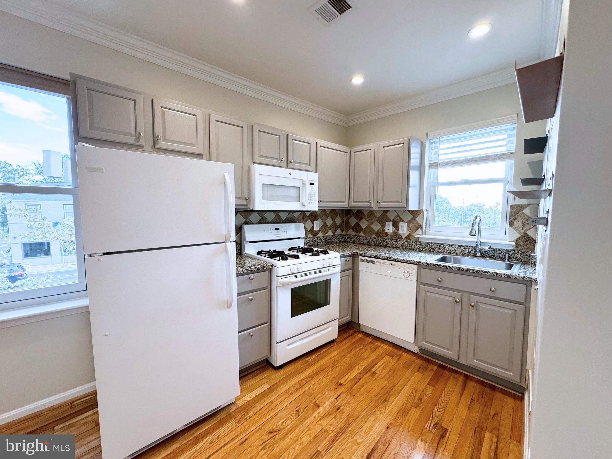 As you step inside, you'll be greeted by an open floor plan that seamlessly connects the living, dining, and kitchen areas. The entire unit boasts gleaming hardwood floors and the kitchen offers ample cabinet space and a stylish backsplash.